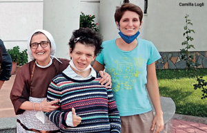 a cantare l’Ave Maria al suono delle campane. Lei ha sofferto molto in questo periodo di pandemia perché le piace stare in mezzo alle persone. Nonostante questo Rejina durante la giornata riesce a creare dei momenti in cui strappa un sorriso a tutti. Poi come ho detto prima, oltre agli ospiti ci sono anche i volontari, che vengono ad aiutare. Ci sono le signore che al mattino vengono a pulire, quando arriva Gina impazzisco di gioia, è molto materna con me. Poi c’è monsignor Simon Kulli che viene tutti giorni a celebrare la messa. Ogni giorno viene Izmir a farmi un’ora di fisioterapia. Spesso appare don Mark che si preoccupa di non farmi uscire quando c’è troppo vento. Ci sono Lisa, Pascka, Tona, Marta, Esterina, Florinda, Mariana e tanti altri che ci aiutano e ci sostengono. In questo periodo suor Maria è ritornata in Italia, però suor Rita non è rimasta da sola, sono arrivate Camilla e suor Teresa. Suor Teresa è altissima, per guardarla devo proprio alzare gli occhi in cielo. Invece Camilla è bassetta, un po’ svampita e lenta a vestirmi, prima di beccare il verso giusto dei miei pantaloni e poi infilarmeli ce ne vuole, però ha margini di miglioramento.