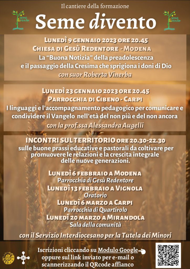 Seme diVento, incontro con la pedagogista Alessandra Augelli Nell’ambito del progetto “Seme diVento. La comunità cristiana cammina con i preadolescenti”, rivolto a educatori, catechisti e genitori e promosso dalle diocesi di Modena-Nonantola e di Carpi, lunedì 23 gennaio, alle 20.45, presso la parrocchia di Sant’Agata Cibeno a Carpi, si è tenuto il secondo incontro: è …