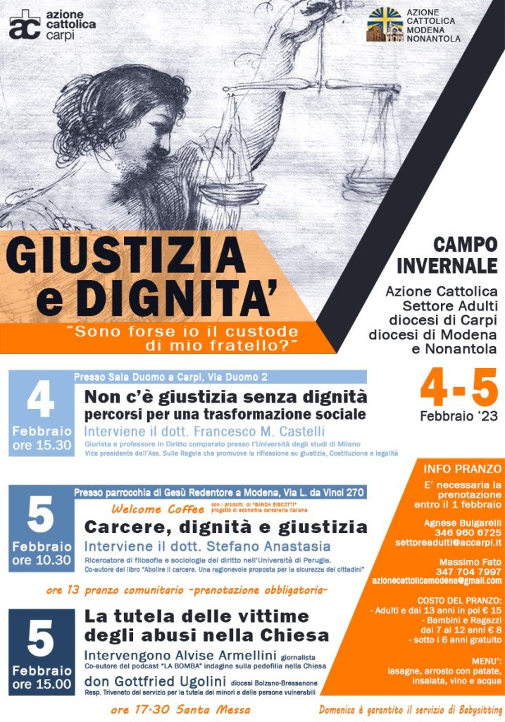 Sabato 4 e domenica 5 febbraio si terrà tra Carpi e Modena il campo interdiocesano adulti Riflettendo su giustizia e dignità Sabato 4 e domenica 5 giugno si terrà il campo invernale organizzato dal settore adulti dell’Azione Cattolica di Carpi in collaborazione con l’Azione Cattolica di Modena-Nonantola. Al centro sarà il tema “Giustizia e dignità. …