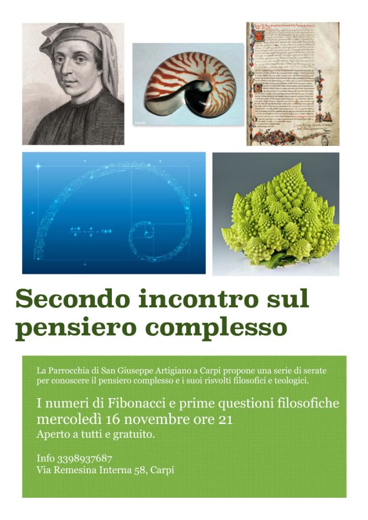 La Parrocchia di San Giuseppe Artigiano a Carpi propone una serie di serate per conoscere il pensiero complesso e i suoi risvolti filosofici e teologici. I numeri di Fibonacci e prime questioni filosofiche Mercoledì 16 novembre ore 21:00 Info 339 893 7687 Via Remesina Interna 58 – Carpi