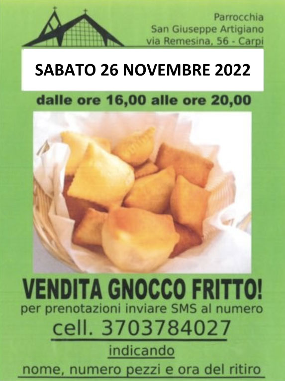 Sabato 26 novembre 2022dalle ore 16:00 alle ore 20:00Vendita gnocco fritto!Per prenotazioni inviare SMS al numero 370 37 84 027indicando nome, numero pezzi e ora del ritiro