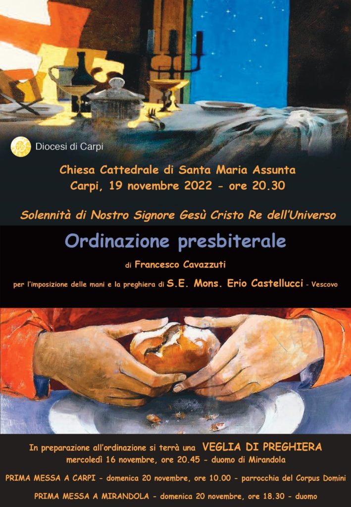 Chiesa Cattedrale di Santa Maria AssuntaCarpi, 19 novembre 2022 – ore 20:30Solennità di Nostro Signore Gesù Cristo Re dell’Universo Ordinazione presbiterale di Francesco Cavazzutiper imposizione delle mani e la preghiera di S. E. Mons. Erio Castellucci In preparazione all’ordinazione si terrà una Veglia di preghiera mercoledì 16 novembre, ore 20:45 presso il Duomo di Mirandola …