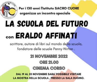 Per i 130 anni l’Istituto Sacro Cuore organizza un incontro specialeLa scuola del futurocon Eraldo AffinatiScrittore, autore di libri sul mondo della scuola,fondatore delle scuole Penny Wirton.21 novembre 2022ore 21:00Cinema CorsoDal 19 al 20 novembre sarà possibile visitare la mostra della scuola, presso la sala duomo.
