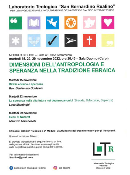 martedì 15. 22. 29 novembre 2022Biblico A: Primo Testamento. DIMENSIONI DELL’ANTROPOLOGIA ESPERANZA NELLA TRADIZIONE EBRAICA 15 novembre: Rav. Beniamino Goldstein;22 novembre: Luca Mazzinghi;29 novembre: Maurizio Marcheselli. Scarica l’intero programma per l’anno 2022/2023 –> NOTE TECNICHEGli incontri dei Moduli si svolgeranno, salva diversa indicazione, presso Sala Duomo (Carpi), a partire dalle 20,45.É prevista la possibilità di …