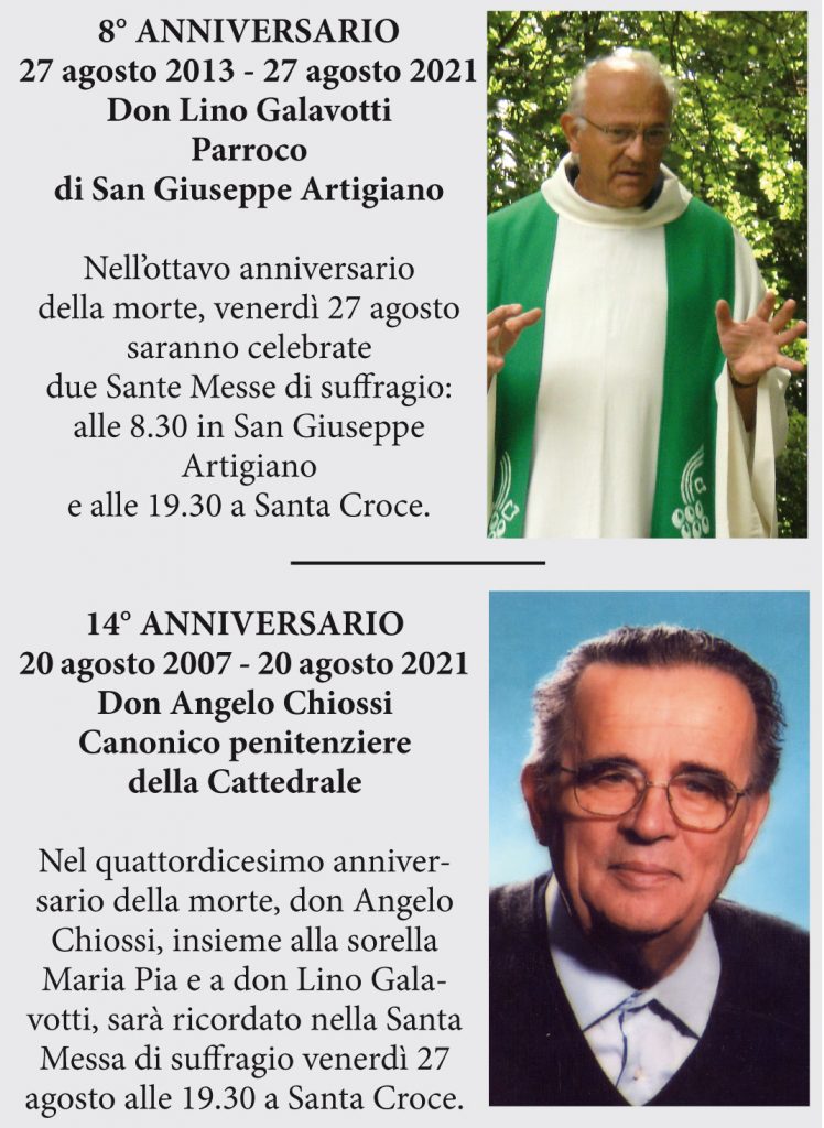 Il 22 settembre don Carlo Bellini in San Giuseppe Artigiano, il 29 settembre don Mauro Pancera in San Bernardino Realino, il 15 ottobre don Andrea Zuarri a Sant’Agata Cibeno Si sono definite le date degli ingressi dei nuovi parroci nelle rispettive parrocchie della Diocesi di Carpi, secondo le nomine decretate dal Vescovo Erio Castellucci nei …
